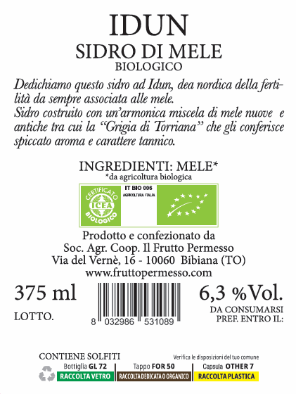 Dedichiamo questo sidro ad Idun, dea nordica della fertilità da sempre associata alle mele. Sidro costruito con armonica miscele di mele nuove e antiche tra cui la “Grigia di Torriana” che gli conferisce spiccato aroma e carattere tannico.